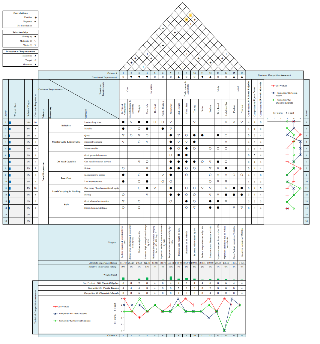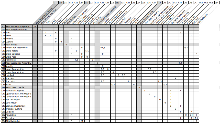 Next we cascaded requirements for our vehicle and looked at how our suspension system integrates together. To create our requirements and see their importance we created a quality function deployment (QFD) diagram to go from customer requirements to functional requirements. Next we looked at our selected vehicle system, the rear suspensions system. We were able to take our vehicle attributes and requirements and cascade them into systems and subsystem requirements. Finally we created and interface matrix and diagram to better organize how teams should communicate to make a cohesive system.